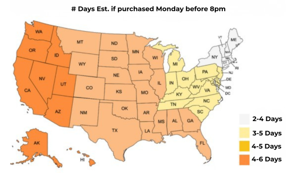 Coffee will be shipped more frequently. Please see the image below for estimated shipping times. If you are in the darker zones, consider freezing your muffins upon arrival and thawing as needed for best experience.
